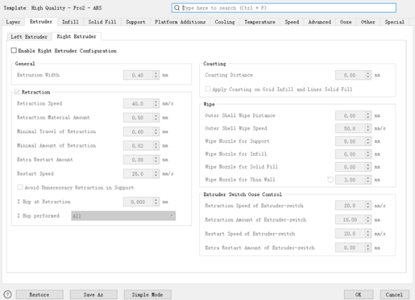 Enable Right Extruder Configuration refers to enabling Right Extruder’s Configuration function the below settings will be activated such as Retraction. If not enabled, the right extruder will continue to use the settings of left extruder.