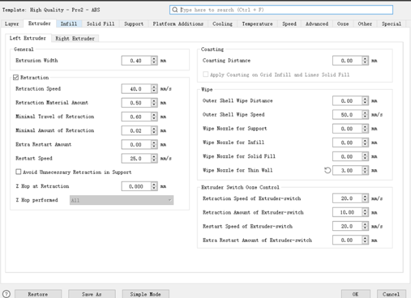 Note: If you have set the Extruder Count to be 2, the Extruder tab will show Left Extruder and Right Extruder. If you have set the Extruder Count to be 1, the Extruder tab will show Primary Extruder only. And we set the primary extruder as left extruder by default.