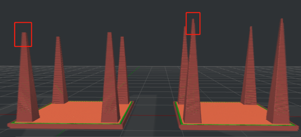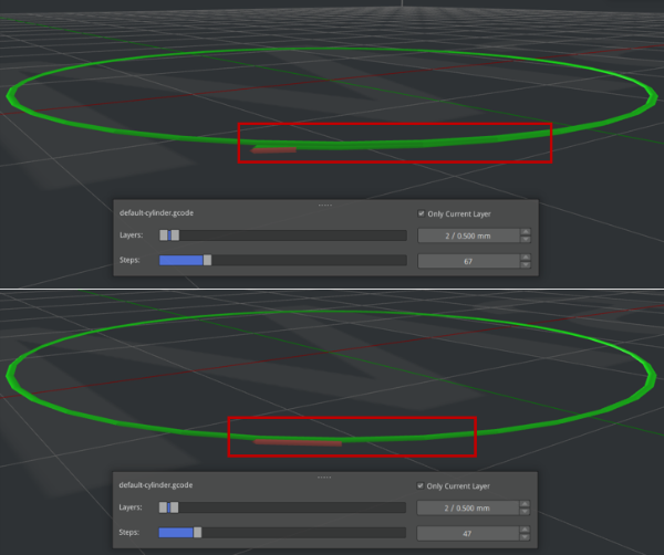 Figure 6: Slicing comparison between the joints with and without Scarf Joint enabled. (enabled for the first screenshot, and disabled for the second screenshot)