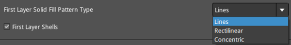 First Layer Solid Fill Pattern Type: The solid fill pattern for the model’s first layer, including Lines, Rectilinear and Concentric.