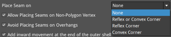 Place Seam on: Places the seam on the specified corner of the shells. When the Layer Start Point Type is Nearest or Auto, this function will be activated. There are four types in all: None, Reflex or Convex Corner, Reflex Corner, Convex Corner,