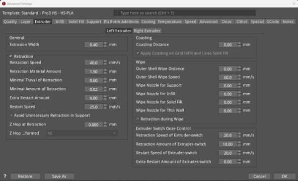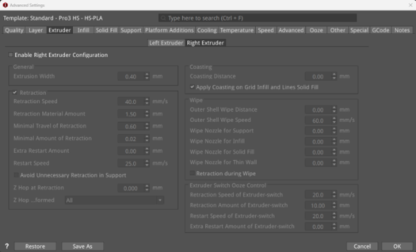 Enable Right Extruder Configuration: With this function enabled, the following settings will be activated, such as Retraction. If it is not enabled, the right extruder will continue to use the settings of the left extruder.