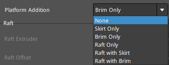 Platform Addition: Decides whether the Raft/Brim/Skirt needs to be added or not. There are six options.