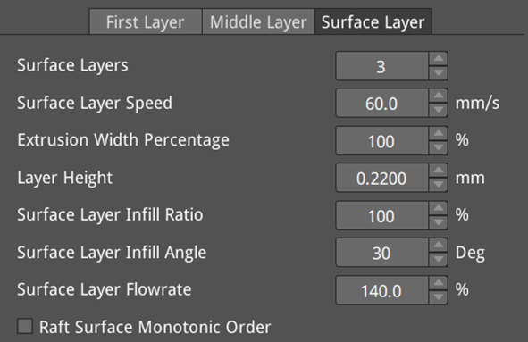 Raft Surface Monotonic Order: With this function enabled, the entire surface layer infill of the Raft will use the monotonic order for printing, which can improve the consistency of the surface of the Raft top layer, but will increase the printing time.