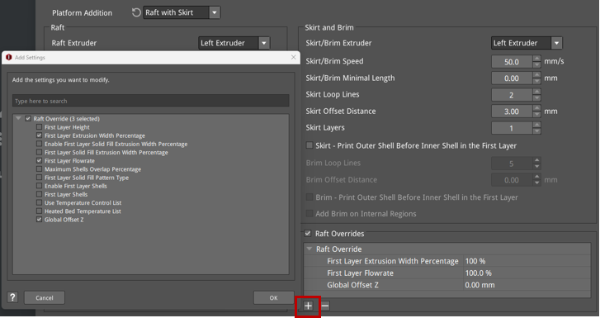 (4) Raft Overrides: With this function enabled, the following settings will be used to override the settings in slicing templates when Raft is enabled. Press + to add more settings, as shown in Figure 17.