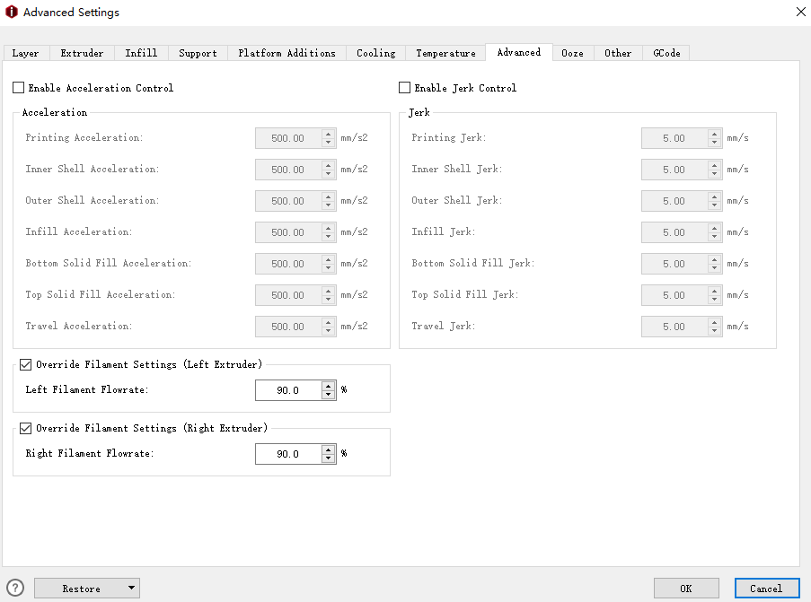 Enable Jerk Control refers to enabling Jerk Control function. The below settings will be activated such as Printing Jerk.