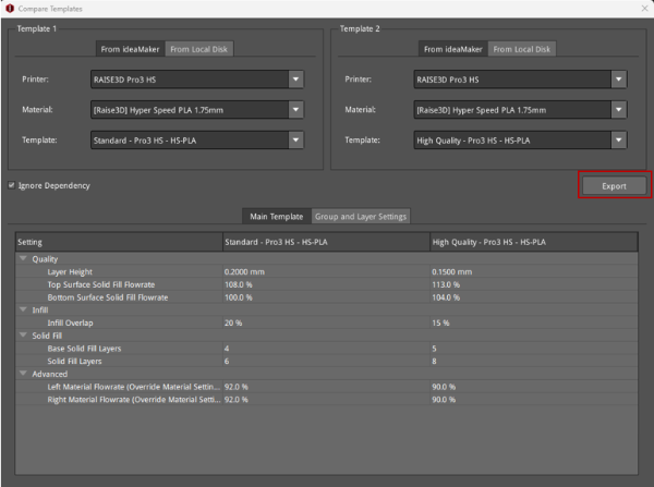 Compare: Refers to comparing selected templates. You can compare different printers, filaments and templates. You can also import the templates from your local disk. After comparison is complete, click Export button (as shown in Figure 1) to save the template comparison report to your local disk.