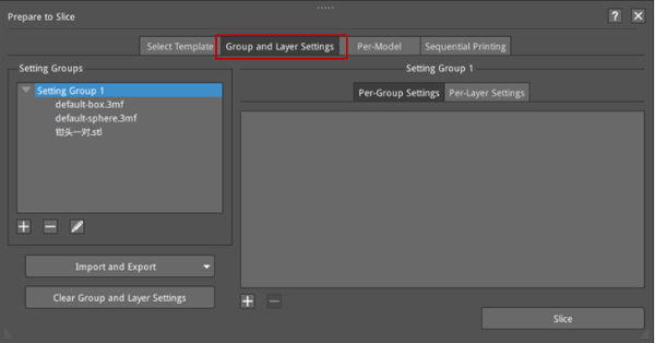 Setting Groups: You can set different groups for your models, and then set different printing parameters for each group. One group can include several models but each model can only be assigned to one setting group.
