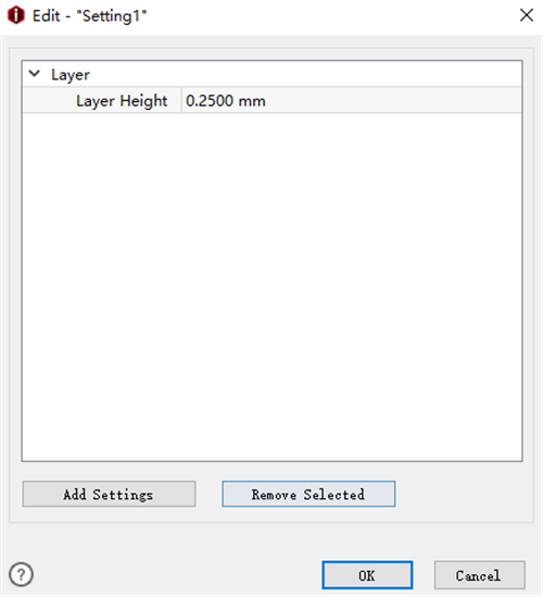 : refers to editing the selected Per-Layer settings. In Figure 1, you can edit the layer height for the define height range in Setting1.