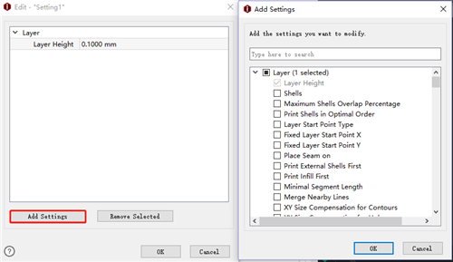 Add Settings refers to adding more settings into the Per-Layer Settings such as left Extruder, Right Extruder, Infill etc.