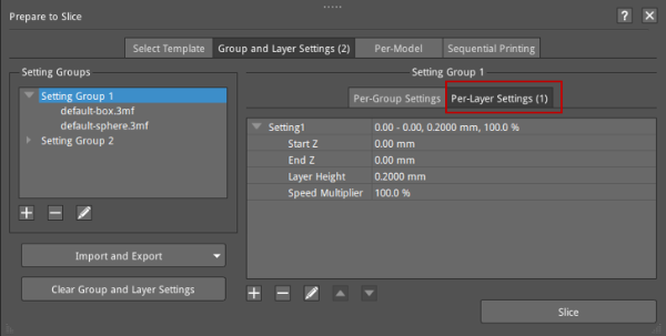 Per-Layer Settings: Sets different printing parameters for different heights of models in the same setting group.