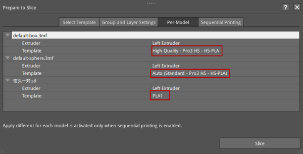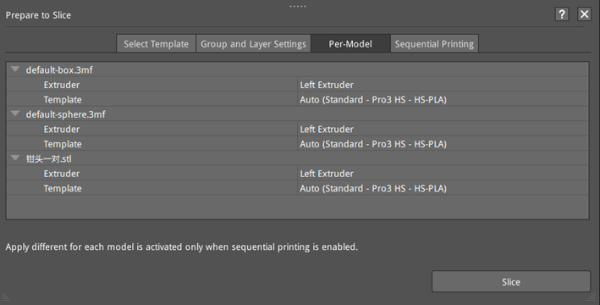 Figure 2: After enabling the sequential printing in the Sequential Printing tab, you can select different printing templates for different models in the Per-Model tab.