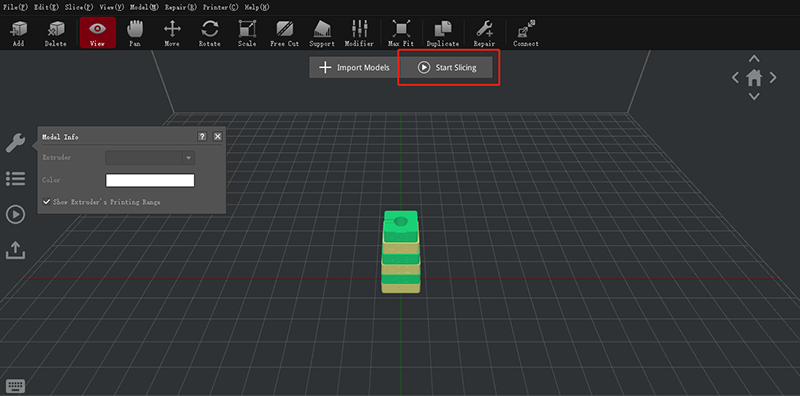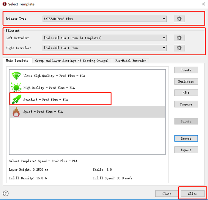 First click "Start Slicing" icon, then choose " Printer Type" as Pro2 series, "Filament" type as Raise3D PLA, and then choose a printing template, last click "Slice" to slice the calibration model (slice the model with default settings, do not change any parameter).