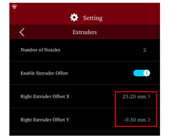 Open the Extruders interface, you can find it under touch screen Setting > Machine > More Settings > Hardware > Extruders, then record the offset value as Figure 6.16. Check they X and Y offsets and add your recorded values to what is shown on the screen. If X was set to 25 and Y was set to 0, we would end with the values shown above based on the example.