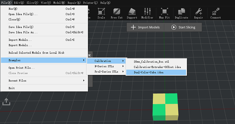 Open ideaMaker, click "File" > "Examples" > "Calibration" > "Dual-Color-Cube.idea".