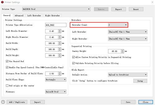 Figure 2: Set the "Extruder Count" to 2. And set filament type for each extruder.