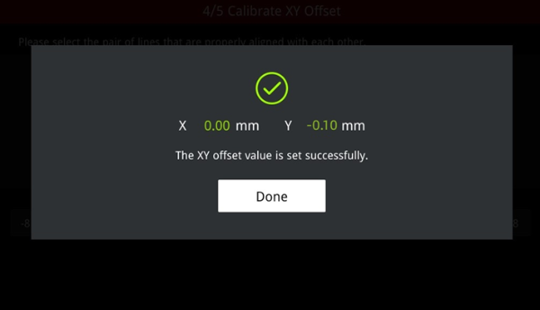 If the models printed by the left and right extruders are well aligned, click the Done button to complete the Calibration XY Offset operation.