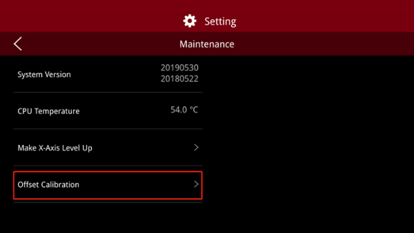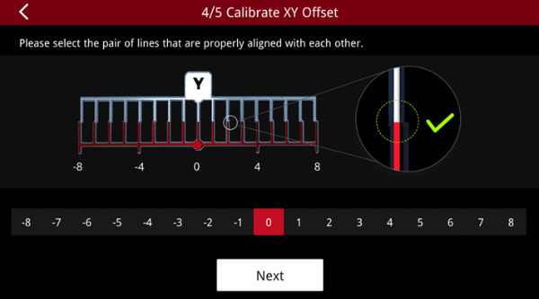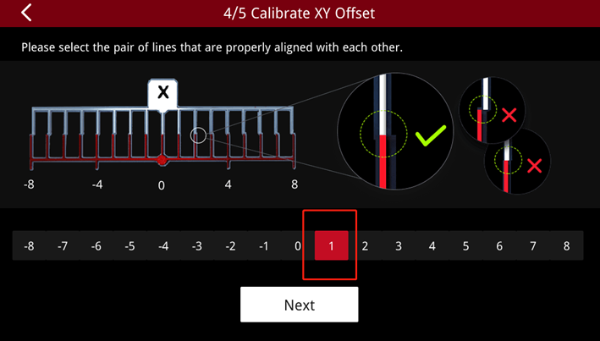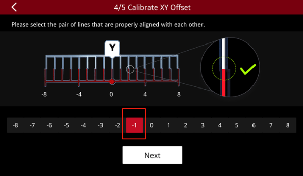 Print the Offset Calibration model. After the printing task is complete, the touchscreen will display the interface, as shown in Figure 8. Select the pair of the left and right lines that you think are properly aligned, then choose the corresponding line number on the touchscreen and click the Next button.