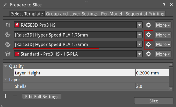 Figure 1: Click the gear icon for the material settings in the Prepare to Slice panel.