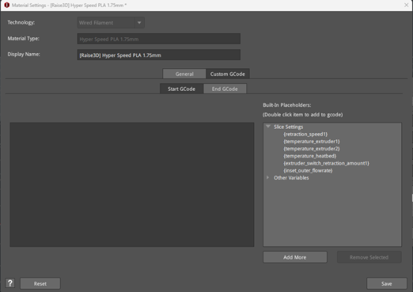 End GCode: The inserted custom GCode in Material Settings will be executed before End GCode in the main template. Custom GCode will be executed from the left extruder to the right extruder if the printer has multiple extruders. You can insert placeholders for slice settings from the settings list on the right side.