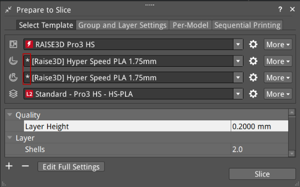 When the setting parameters of the official material are different from the default values, an asterisk (*) will appear before the material’s name in the Prepare to Slice panel, as shown in Figure 6.