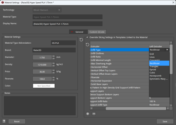 Figure 4: Edit the slicing settings in the Material Settings panel.