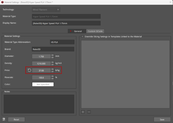 In this panel, you can edit the material’s parameters, such as Display Name, Material Type Abbreviation, Brand, Display Name, Diameter, Density, Price, Flowrate, and so on.