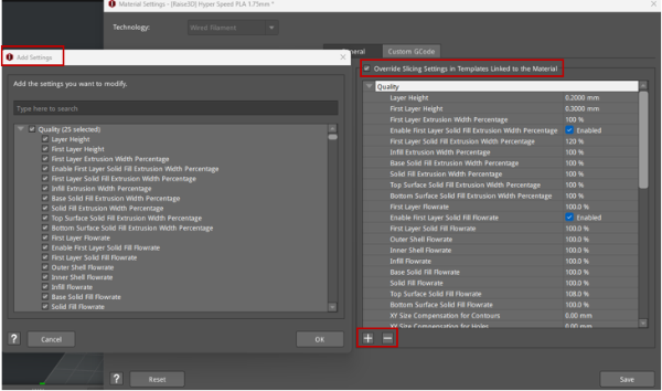 Override Slicing Settings in Templates Linked to the Material: With this function enabled, the following settings will be used to override settings in the slicing template which is linked to the current filament. Click + to open the Add Settings panel to choose more settings, as shown in Figure 3. Click – to delete the selected settings.