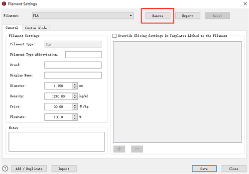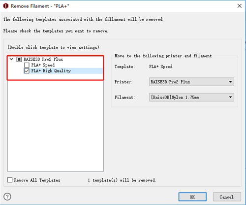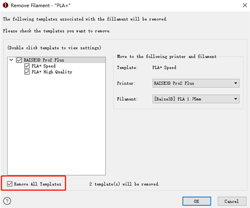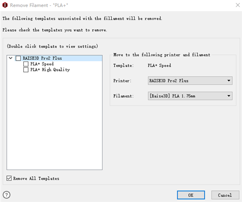 If you do not want to keep any slicing template under this filament type, check Remove All templates below. It will check all the slicing templates above. Then click "OK" button. All the slicing templates under this filament type will be removed together with this filament.