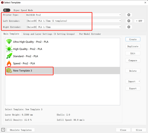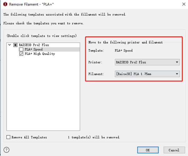 Select it and choose the Printer and Filament at right side for it. Then press "OK" button below. The filament template will be removed, but this slicing template will be saved under the printer "RAISE3D Pro2 Plus" and the filament "RAISE3D PLA 1.75mm" in this case.