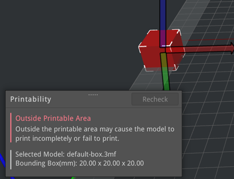 Distance From Border of Build Plate: Keeps a safe distance from the border of the build plate, as shown in Figure 1. This function will check if there are models placed outside the extruder’s printable area. If the model has exceeded the spacing distance of the border, it will turn red, and the Printability panel will prompt "Outside Printable Area", as shown in Figure 2
