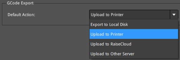 Ø Upload to Other Server: Uploads the sliced GCode files to other servers, such as OctoPrint and Repetier.