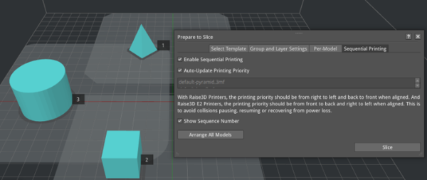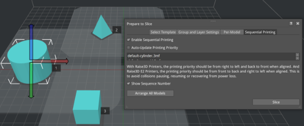 Validate Printing Priority before Slicing: With this function enabled, ideaMaker will check whether the printing order of the model is valid or not. For Raise3D printers, the printing priority should be from right to left and back to front. For Raise3D E2 printers, the printing priority should be from front to back and right to left, when aligned. This is to avoid collisions when pausing, resuming or recovering from power loss. It is recommended to validate the printing priority with Raise3D printers.