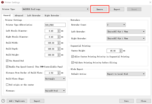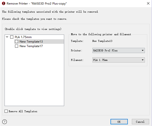 If you do not want to keep any slicing template under this printer type, check Remove All templates below. It will check all the slicing templates above. Then click "OK" button. All the slicing templates under this printer type will be removed together with this printer.