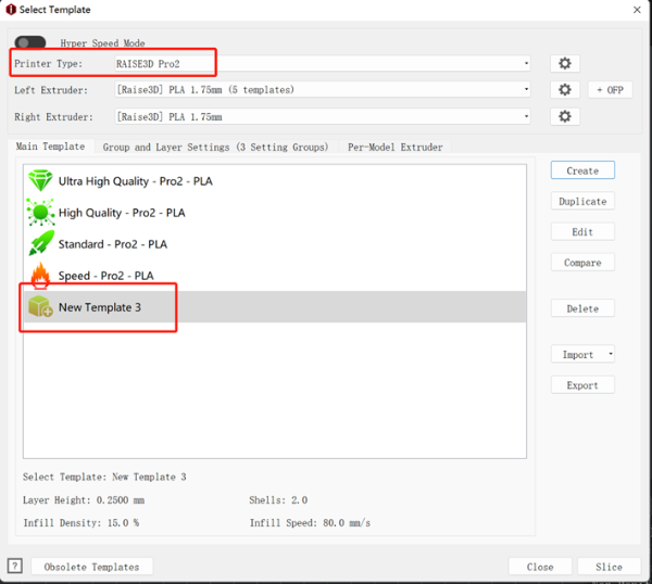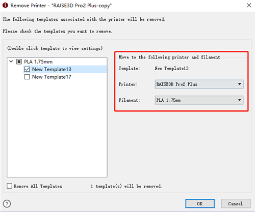 Select it and choose the Printer and Filament at right side for it. Then press "OK" button below. The printer template will be removed, but this slicing template will be saved under the printer "RAISE3D Pro2 Plus" and the filament "PLA 1.75mm" in this case.